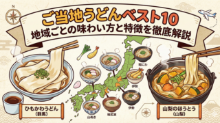 日本三大うどん(讃岐・稲庭・水沢)をはじめ、伊勢・博多・氷見・武蔵野・ひもかわ・五島うどん、山梨のほうとうまで徹底解説。地域ごとの特徴や食べ方、観光とあわせた楽しみ方がわかる「ご当地うどんベスト10」完全ガイドです。